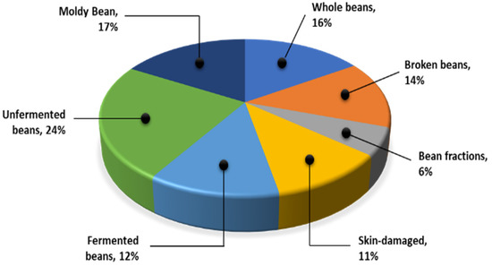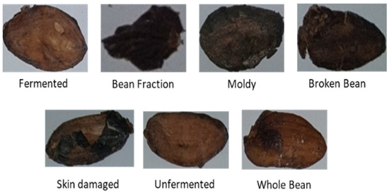 Based on the Indonesian Standardization Institution’s regulations for exporting quality, cocoa beans are divided into seven classes. First, whole beans have a complete seed coat covering the whole seed without fractures. Another type of cocoa bean is broken beans, which have half (1/2) or less of a bean left. The next type is the bean fraction, which is less than half (1/2) of the whole bean. The fourth type of cocoa bean is a skin-damaged bean, which has a missing shell and is half the size of a whole bean. The fifth type of bean is fermented beans, which are washed or unwashed after curing and drying. Sixth, unfermented beans (e.g., slate or solid grayish blue) are composed of sliced grayish chips with a dirty white surface. Lastly, there are moldy beans, which are cocoa beans with mold on the inside, and when split open, it is easy to see the mold inside. All of these samples can be seen in Figure 5.