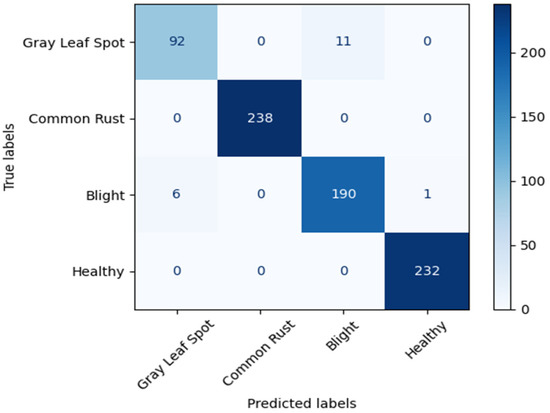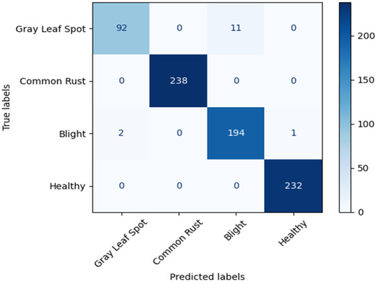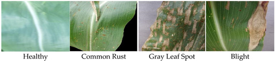 To achieve a deeper evaluation of the performance of the proposed method, we conducted experiments on the corn leaf disease dataset and further compared the accuracy with the previous work assessed on this dataset. The corn leaf disease dataset is part of the plant leaf disease dataset. As depicted in Figure 6, the dataset has 4188 images in total and comprises four classes including healthy corn, corn with common rust, corn with gray leaf spot, and blight. We randomly split the data into 80% for training and 20% for the evaluation stage.
