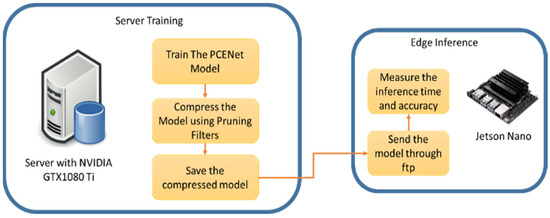 To deploy and assess the models into an edge platform, we performed the scheme illustrated in Figure 7. The training was completed on the PC with the Ubuntu 16.04 operating system and NVIDIA 1080Ti. After training, the models were pushed and deployed into Jetson Nano using ftp (file transfer protocol). Once the ftp transfer was done, the inference stage was performed to evaluate the computational time on the edge platform. As described in Table 5, the computational time of our approach in Jetson Nano is only 0.06 s as it is lower than the existing PCENet, which is 0.101 s.