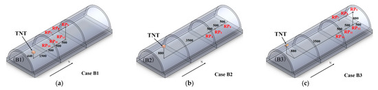Layout of reflected overpressure sensors (unit: mm): (a) Case B1; (b) Case B2; (c) Case B3.