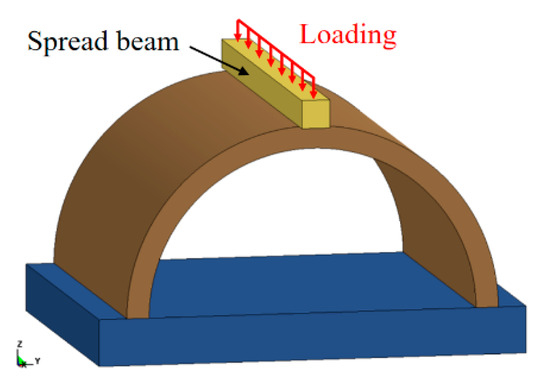 Figure 6 shows the FE model of the intact specimen under static loading. For the FE model of static loading, the spread beam vertically moved to the tunnel crown with a constant velocity of 0.1 mm/ms. In addition, to obtain the residual bearing capacity of the blast-damaged specimens, it was necessary to first apply a small restart after the explosion simulation. The aim was to allow the blast-damaged specimen to vibrate freely. When the global system stabilized, a full restart function in LS-DYNA was employed to connect the explosion and static loading phases. It should be noted that dynamic explicit analysis was employed in all phases. The simulation process for the calculation of the residual bearing capacity of the blast-damaged specimen is shown in Figure 7.