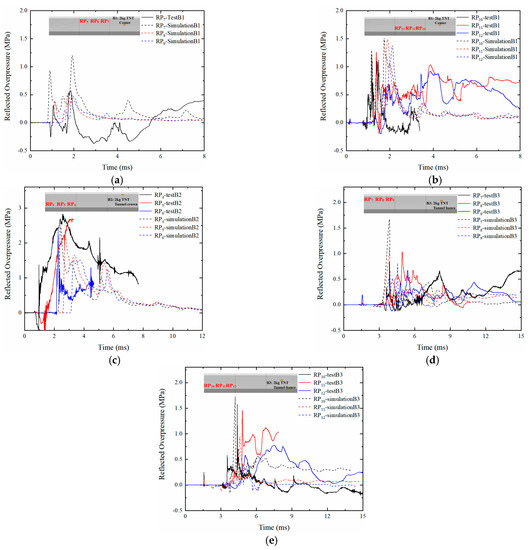 Time histories of reflected overpressure: (a,b) Case B1; (c) Case B2; (d) and (e) Case B3.
