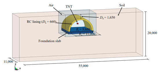 Based on the above validated material model and modeling algorithm, the FE model of the tunnel entrance was scaled up to the prototype of the tunnel entrance with a scale ratio of 1:5.5, as shown in Figure 10. In the FE model of the prototype of the tunnel entrance, the outer diameter Ro and inner diameter Ri of the RC lining were 11 m and 9.68 m, respectively, and, thus, the lining thickness DL was 0.66 m. A diameter (d) of 24 mm was utilized at both double layers of the bidirectional rebars. The dimensions of the surrounding soil layer were 55,000 × 11,000 × 20,000 mm (length × width × height), and the buried depth (Ds) was determined to be 1.65 m. The mesh sizes for the key components in the FE model of the prototype of the tunnel entrance were consistent with those verified in Section 2.2.1 (i.e., a mesh size of 15 mm was used for the center of the RC lining, and 20 mm was used for the rest of the Lagrangian models). Outflow boundaries were imposed around the perimeter of the ground to simulate an infinite space of surrounding rock.