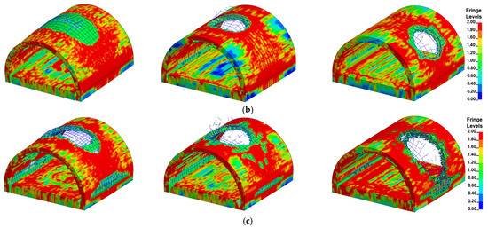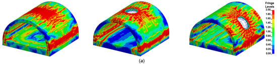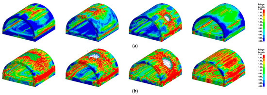 where F0 is the maximum bearing capacity of the intact tunnel entrance. Fr is the residual bearing capacity of the blast-damaged tunnel entrance, which can be determined from the FE simulation. In this paper, it is assumed that the damage level for the tunnel entrance after an internal explosion can be divided into four categories based on the degradation degree of the bearing capacity: light damage, moderate damage, severe damage and complete damage [60]. Table 13 gives the threshold values for different damage levels in the tunnel entrance.