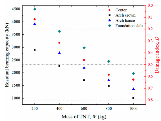 In the present study, the maximum bearing capacity of the prototype tunnel entrance was determined to be 4640 kN via the FE simulation, as stated in Section 2.2. Figure 11 selectively illustrates the damage pattern of the prototype tunnel entrance subjected to the internal explosion with three different TNT charge weights (W = 454, 1814, 4536 kg). It is noted that there were three blast scenarios for each TNT charge weight (i.e., the central noncontact explosion, the contact detonation at the tunnel crown and the contact detonation at the tunnel hance). As shown in Table 12, there was no significant reduction in the residual bearing capacity of the tunnel entrance when W was 23 kg, implying that the suitcase bomb posed little threat to the tunnel entrance.