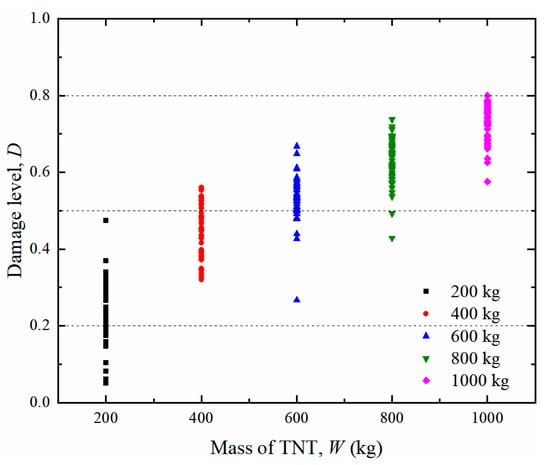 - When the charge weight (W) was in the range of 0–100 kg, the probability of damage to the tunnel entrance increased rapidly. As the charge weight increased past 300 kg, the tunnel entrance’s probability of slight damage reached 1.0. When W varied from 200 to 1000 kg, the damage to the tunnel entrance shifted from moderate to severe. However, the tunnel entrance’s probability of complete damage was less than 10% when the TNT charge weight did not exceed 1000 kg. The established vulnerability diagram can be used for probabilistic assessment of the damage level in tunnel entrances subjected to various charge weights or detonation points.