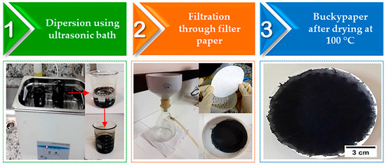 Schematic flowchart of BP production steps. (1) Dispersion; (2) filtration; (3) final buckypaper element.
