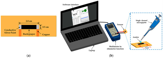 Schematic illustration showing (a) top view configuration and dimensions of the sensor and (b) the arrangement used in R × t measurements, where analytes were added with the aid of a single channel micropipette.