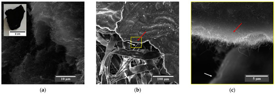 The SEM micrograph in Figure 3a shows the MWCNTs-COOH received as flakes (inset), where it is possible to observe that the MWCNTs form an agglomerated morphology. The micrograph of Figure 3b shows that the morphology of the produced BP is based on a nanostructured sheet composed of a layer of MWCNTs-COOH (see red arrow in Figure 3b,c) distributed on the surface and between the micrometric cellulose fibers of the filter paper (see white arrow in Figure 3b,c), as evidenced in the high-magnification SEM micrograph in Figure 3c.