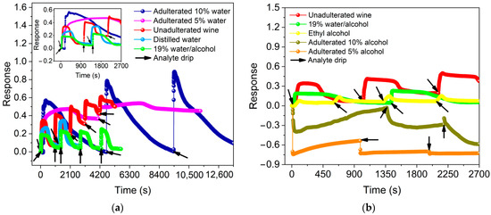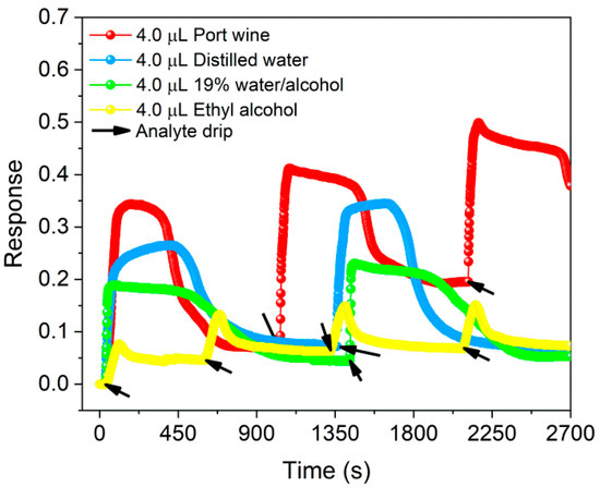 The comparative result of the mean response–recovery times for 4.0 µL of distilled water, ethyl alcohol, unadulterated and adulterated Port wine, shown in Figure 6b and summarized in Table S1 of the Supplementary Material, shows τRes and τRec of 78.0 ± 12.72 s and 181.5 ± 9.19 s for distilled water, 65.5 ± 5.74 s and 126.5 ± 12.23 s for ethyl alcohol and 95.5 ± 31.29 s and 163.0 ± 61.11 s for unadulterated Port wine, respectively. Adulteration of wine with distilled water caused an increase in the τRes and τRec of the sensor, being 2240 ± 763.67 s and 2688 ± 876.81 s for 5 vol.% of water and 103.3 ± 70.94 s and 3035 ± 404.75 s for 10 vol.% water, respectively. The τRes and τRec for wine adulterated with 10 vol.% ethyl alcohol increased to 105.0 ± 95.0 s and 870.5 ± 377.0 s, respectively. However, τRes for wine adulterated with 5 vol.% ethyl alcohol decreased to 10.0 ± 3.60 s, although τRec increased to 1030.6 ± 116.86 s. At both concentrations, the τRec for adulteration with alcohol was lower than that for water.