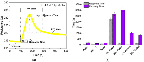 (a) Dynamic response curve employed to determine the response time (τRes) and the recovery time (τRec) based on one cycle of the chemiresistor in the presence of 4.0 µL of ethyl alcohol. (b) Comparative mean response and recovery times for 4.0 µL of distilled water, ethyl alcohol, unadulterated and adulterated Port wine with 5 vol.% and 10 vol.% of distilled water and ethyl alcohol.