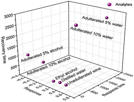 Three-dimensional diagram for 4 µL of ethyl alcohol, distilled water, unadulterated Port wine and adulterated with 5 vol.% and 10 vol.% of distilled water and alcohol as a function of response, response time and recovery.