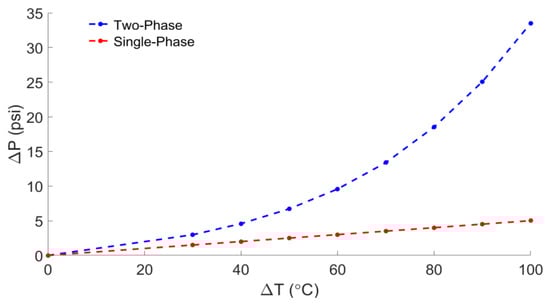Therefore, the authors have developed a smart, flexible MEMS piezoresistive pressure sensor capable of self-calibration, presented in previous publications [,]. In the enclosed side of the sensor membrane, the system heats the air to increase the cavity pressure (referred to as the “single-phase sensor” below). Then the internal temperature is measured by a thermistor to calculate the internal pressure, which is compared with the sensor output. Previous modeling work by the authors has shown that the cavity heater could result in a 3 psi increase in the sensing cavity, but 95% of the heat generated was lost to conduction through the substrate. In this study, to extend the calibration range and increase the power efficiency, the authors introduced a liquid-to-vapor phase change in the sensing cavity, since evaporation leads to a significant pressure rise (referred to as the “two-phase sensor” below). Deionized water was chosen for the cavity liquid due to its availability, low corrosivity, low conductivity, and predictable phase-change behavior [,].