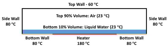 In the flow field, three working fluids were defined as the cavity fluid: ideal-gas air, ideal-gas water vapor, and liquid water, while a Volume of Fluid (VoF) model described the water–vapor phase change. At the start of the simulation, the bottom 10% volume of the cavity was room temperature liquid water, and the other 90% was filled with room temperature air.