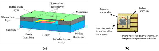 The self-calibrating pressure sensor’s sensing element, shown in Figure 5, has a 4 mm square base and a total height of 405 μm. Pressure sensors are fabricated from a silicon-on-insulator (SOI) wafer, which consists of a thin silicon device layer, a buried oxide layer (BOX), and a silicon base or handle layer. A hollow reference cavity is carved out of the silicon base layer using deep reactive-ion etching (DRIE). On the device layer, four piezoresistors are arranged in a Wheatstone bridge configuration with gold electrical interconnection lines and pads for packaging. Before the polyimide substrate is bonded to the pressure sensor chip to create the sealed reference cavity, both the gold thin film-based cavity heater and thermistor are manufactured directly onto the substrate surface. With the heater enclosed with the thermistor in the sealed reference cavity, a controllable thermopneumatic actuator is formed, giving the sensor self-calibrating capabilities []. As the heater heats the fluid in the reference cavity, the fluid evaporates and expands, deforming the membrane and the device layer. In addition, a surface thermistor fabricated beside one of the pressure-sensing elements monitors the device layer’s temperature.