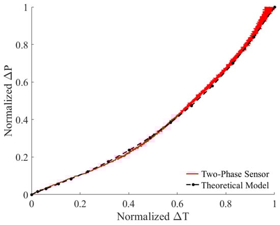 where ΔX is either the cavity pressure or temperature change, and ΔXmin and ΔXmax refer to the minimum and maximum value of ΔX, respectively. The results were compared to the normalized theoretical pressure change according to Equations (5) and (6), as shown in Figure 6. The two overlapping nonlinear curves proved the existence of a water liquid-to-vapor phase change in the sensor cavity.