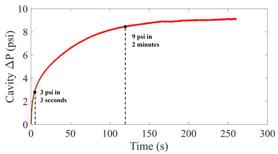 During the sensor tests, the cavity heater was turned on to 0.45 W and held until the cavity temperature reached a steady state. Figure 7 shows the resulting cavity pressure as a function of time. Three seconds after turning on the heating element, the cavity pressure in the prototype two-phase sensor increased by 3 psi, reaching the equilibrium pressure change in the single-phase sensor at similar heater power levels [], but within a much quicker time. The pressure change is increased to 9 psi after just 2 min, tripling the effective range of self-calibration of the sensor. The gauge pressure in the sensor cavity also appears to reach 9.5 psi at the steady state, closely matching the 2D cavity Ansys Fluent model (9.8 psig). The calibration time can be further improved to a few seconds with a pulsed heating power.