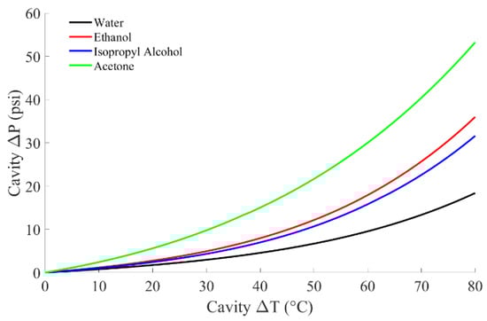 Future work will include the investigation of alternative cavity liquids that could provide higher reference pressures without increasing heater power demands to extend the calibration range further. Figure 9 shows the simulated pressure change caused by ethanol, isopropyl alcohol, and acetone compared to water. These liquids were chosen due to their lower saturation temperatures at atmospheric pressure than water, resulting in higher vapor pressures at a given temperature [].