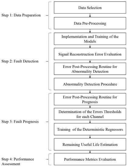 Another reason for adopting this approach is the unbalanced proportion of monitoring data between faulty and non-faulty conditions in an industrial scenario since some failure events are rare for certain types of equipment. Then, the availability of a great array of data in the normal operating conditions of a CES is attractive for the use of data-driven methodologies. The steps for implementing the prognosis framework and RUL prediction are expressed in the flowchart in Figure 1.