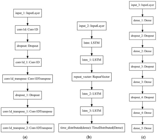Representation of the autoencoders’ architectures. Each box indicates a layer, and the arrows indicate the information flow. (a) Conv-1d. (b) LSTM. (c) MLP.