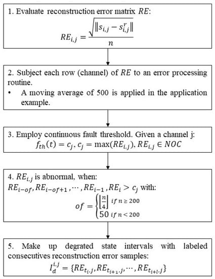 The main part of Step 2 is summarized in the flowchart presented in Figure 3 and exemplified by the graphics in Figure 4. The non-conformities are detected in this work by using a set of continuous threshold functions fth(t) = cj, (cj is the maximum value between the post-processed RE samples labeled as NOC for the jth channel). Samples of the post-processed RE1:n,j that exceed cj are labeled as abnormalities. Sometimes the post-processing of RE alone is not enough to avoid the occurrence of false positives, which are caused by pointwise or small cluster point addressing. To highlight the cumulative abnormality resulting from the monotonic growth of the degradation pattern, an offset of consecutive abnormal labeled points is used as a requirement for pointing out the beginning of the degradation.