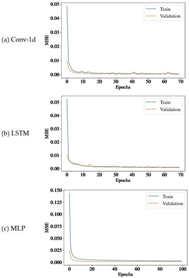 MSE loss convergence during the networks’ training progression: (a) Conv-1D; (b) LSTM; and (c) MLP.