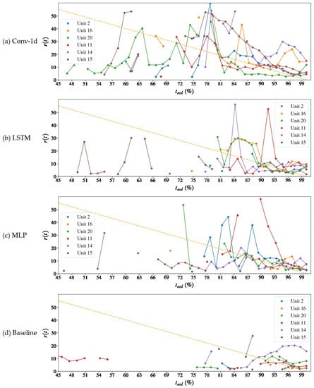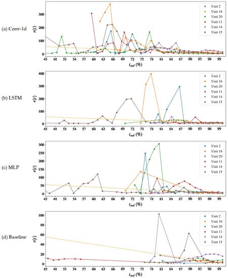 Progression of predictions over units’ operational time— ( )—for the autoencoder reconstruction error extrapolation method and Baseline model. The dashed orange line means the ground truth RUL. In (a) results are presented for the Conv-1d autoencoder, (b) LSTM, (c) MLP and (d) for the Baseline model.