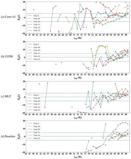 The difference between the forecast and the actual value of the , also expressed as a percentage of the , is shown in Figure 10 and Figure 11. The blue dashed lines indicate 20% error limits in Figure 10 and 5% error limits in Figure 11, which is taken as a reference for calculating the prognostic horizon. The proposed method manages to keep the estimates within the error margin of +/− 20% , but it has complications in meeting the goal of +/− 5% , with only a few units achieving this result even after 80% of the machine’s life. There are two possible reasons for this answer: the first one, mentioned above, is the absence of a global tuning of the model, including the neural architecture, which is not at its optimal performance in terms of training with NOC samples; the second one is the uncertainty regarding the choice of the error threshold for the prognosis, which can increase the estimates above what was expected.