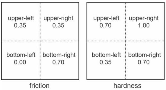 The two variables—friction and hardness—are represented in the two tests. Each test is divided into four virtual surfaces. There is a specific value for each surface, but two out of the four surfaces had the same values.