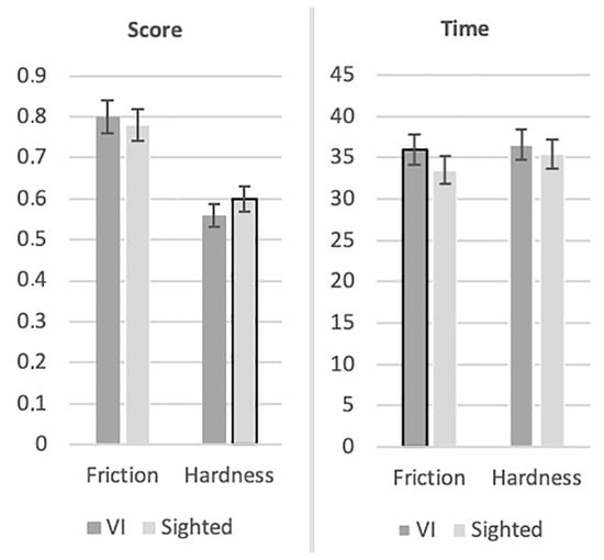 More specifically, for surfaces that differed a lot from each other in “hardness”, the participants presented higher scores compared to their scores for surfaces which did not differ from each other (the same surfaces) or for surfaces which differed from each other slightly in terms of “hardness”. In addition, with reference to surfaces that differed a lot from each other in terms of “hardness”, the participants presented lower completion time compared to the pairs that did not differ from each other (the same surfaces) in terms of “hardness”. Finally, participants with VI presented lower scores compared to sighted participants, but they did not present higher completion time.