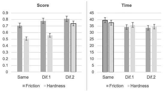 Participants’ score and completion time for those surfaces that had the same value of friction or hardness or surfaces that differed from each other slightly (Dif.1) or a lot (Dif.2) in terms of the value of friction or hardness. The significant differences are highlighted with a black border.