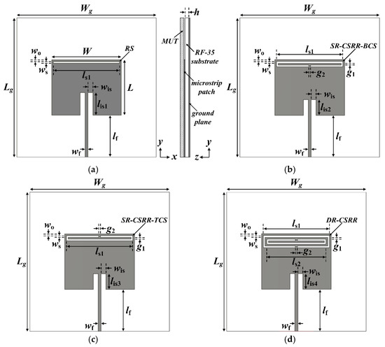 Geometries of the rectangular MPAs loaded with (a) a rectangular slot (RS), (b) a single-ring complementary split ring resonator with a bottom-edge center split (SR-CSRR BCS) slot, (c) an SR-CSRR with a top-edge center split (SR-CSRR TCS) slot, and (d) a double-ring CSRR (DR-CSRR) slot.