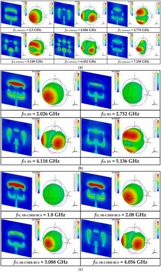 Figure 3c presents the electric field distributions and radiation patterns at the resonant frequencies for the SR-CSRR-BCS slot-loaded MPA. The first four resonant frequencies of the SR-CSRR-BCS slot-loaded MPA occurred at fr1,SR-CSRR-BCS = 1.8 GHz, fr2,SR-CSRR-BCS = 2.08 GHz, fr3,SR-CSRR-BCS = 3.088 GHz, and fr4,SR-CSRR-BCS = 4.056 GHz. In this case, the first three resonant frequencies show a broadside direction radiation pattern. fr1,SR-CSRR-BCS is the TM010 mode loaded with the part of the SR-CSRR-BCS slot adjacent to the edges of the patch, whereas fr2,SR-CSRR-BCS is the TM010 mode loaded with the bent part of the SR-CSRR-BCS slot. fr3,SR-CSRR-BCS is the perturbed TM020 mode of the SR-CSRR-BCS slot-loaded patch. This can be seen from the surface current distributions at the first three resonant frequencies of the SR-CSRR-BCS slot-loaded MPA in Figure 4c. The frequency location of the first resonant frequency, fr1,SR-CSRR-BCS, is lower than that of the first resonant frequency, fr1,RS, for the RS-loaded MPA, because of the increased slot length of the SR-CSRR-BCS. The remaining fr4,SR-CSRR-BCS is in TM200 mode.