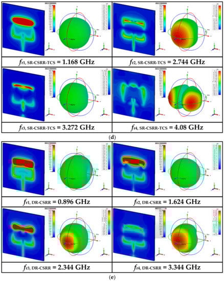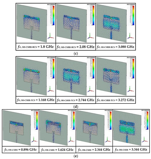 Figure 3e shows the electric field distributions and radiation patterns at the resonant frequencies for the DR-CSRR slot-loaded MPA. The first four resonant frequencies of the DR-CSRR slot-loaded MPA appeared at fr1,DR-CSRR = 0.896 GHz, fr2,DR-CSRR = 1.624 GHz, fr3,DR-CSRR = 2.344 GHz, and fr4,DR-CSRR = 3.344 GHz. In this case, the first four resonant frequencies show a broadside direction radiation pattern. The whole DR-CSRR slot-loaded patch acts as a folded radiator at fr1,DR-CSRR, whereas fr2,DR-CSRR is the TM010 mode of the DR-CSRR slot-loaded patch loaded with the outer ring part of the DR-CSRR slot adjacent to the edges of the patch. The first resonant frequency (fr1,DR-CSRR) of the DR-CSRR slot-loaded MPA is the lowest among the four slot-loaded MPAs. fr3,DR-CSRR is the TM010 mode of the DR-CSRR slot-loaded patch loaded with the inner part of the DR-CSRR, whereas fr4,DR-CSRR is the perturbed TM030 mode of the DR-CSRR slot-loaded patch. Figure 4e shows the surface current distributions at the first four resonant frequencies of the DR-CSRR slot-loaded MPA.