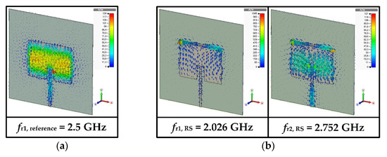Figure 3b shows the simulated electric field distributions and radiation patterns at the resonant frequencies for the RS-loaded MPA. The first four resonant frequencies of the RS-loaded MPA were at fr1,RS = 2.026 GHz, fr2,RS = 2.752 GHz, fr3,RS = 4.118 GHz, and fr4,RS = 5.136 GHz. fr1,RS is the TM010 mode of the RS-loaded patch, whereas fr2,RS is TM020 mode. Figure 4b shows the surface current distributions of fr1,RS and fr2,RS. The surface current distribution at fr1,RS is similar to that of the TM010 mode for the reference MPA, as shown in Figure 4a, and the frequency location is shifted toward a lower frequency because of the loading effect of the RS. For fr2,RS, the surface currents circulate around the RS, and a null exists near the RS [38]. This perturbs the current distribution of the original TM020 mode with two peaks, and the currents of the perturbed TM020 mode become similar to those of the TM010 mode with a single peak, as shown in Figure 4b. Therefore, the radiation pattern of the perturbed TM020 mode becomes similar to that of the TM010 mode, which is a broadside direction (+z axis) radiation pattern. Other remaining resonant frequencies are similar to the higher-order modes of the reference MPA. fr3,RS is TM200 mode, whereas fr4,RS is TM210 mode.