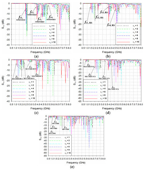 Input reflection coefficient responses of the reference and four slot-loaded MPAs for varying the relative permittivity of the MUT superstrate from 1 to 10: (a) the reference rectangular MPA, (b) the RS-loaded MPA, (c) the SR-CSRR-BCS slot-loaded MPA, (d) the SR-CSRR-TCS slot-loaded MPA, and (e) the DR-CSRR slot-loaded MPA.