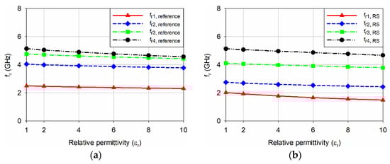 Figure 5 shows the input reflection coefficient responses of the reference and four slot-loaded MPAs when varying the relative permittivity of the MUT superstrate from 1 to 10 with a loss tangent = 0. The thickness of the MUT superstrate was chosen at 1.6 mm [34], and the dimensions of the MUT were the same as the ground plane. Figure 6 shows the first four resonant frequencies of the reference and four slot-loaded MPAs, and Table 2 lists their values. Because the values of the resonant frequencies are all different and it is difficult to compare the sensitivity for each resonant frequency directly using the frequency shift itself, the percentage relative frequency shift (PRFS) of the resonant frequencies was defined using Equation (5) to compare the relative permittivity sensitivity of the first four resonant frequencies for the reference and four slot-loaded MPAs. Figure 7 shows the PRFS characteristics of the first four resonant frequencies for the reference and four slot-loaded MPAs.