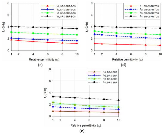 Comparison of the first four resonant frequencies for the reference and four slot-loaded MPAs when varying the relative permittivity of the MUT superstrate from 1 to 10: (a) reference rectangular MPA, (b) RS-loaded MPA, (c) SR-CSRR-BCS slot-loaded MPA, (d) SR-CSRR-TCS slot-loaded MPA, and (e) DR-CSRR slot-loaded MPA.