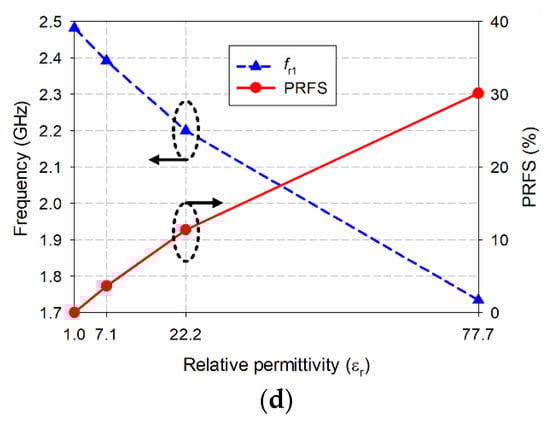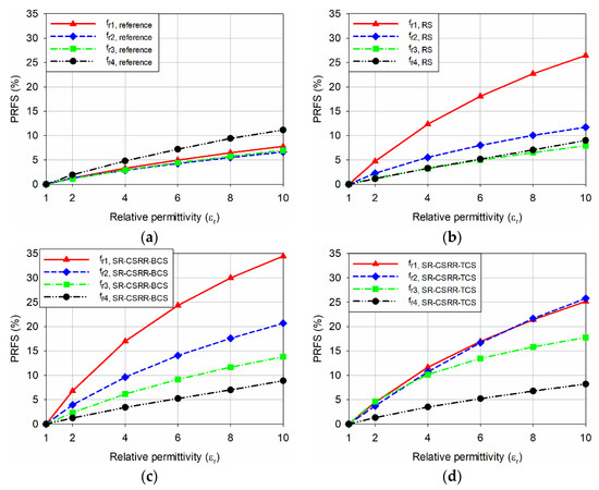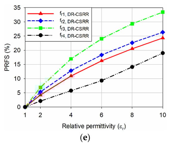 The PRFS of the first four resonant frequencies for the reference MPA was smaller than 11.2% when the relative permittivity of the MUT varied from 1 to 10, and that of the fourth resonant frequency, fr4,reference, was the largest (Figure 7a). When the RS was loaded on the patch of the reference MPA, the PRFS of the first resonant frequency, fr1,RS, was increased to 26.5%, with the largest enhancement. On the other hand, the PRFS of the remaining resonant frequencies was less than 11.7%. For the SR-CSRR-BCS slot-loaded MPA, the PRFS of fr1,SR-CSRR-BCS was increased to 34.4%, whereas PRFS of fr2,SR-CSRR-BCS, fr3,SR-CSRR-BCS, and fr4,SR-CSRR-BCS were 20.7%, 13.8%, and 8.9%, respectively. Therefore, the first resonant frequency, fr1,SR-CSRR-BCS, has the largest PRFS among the four, and its sensitivity enhancement was better than fr1,RS. When the SR-CSRR-TCS slot with the split position close to the radiating edge was loaded on the patch, the PRFS of fr1,SR-CSRR-TCS, fr2,SR-CSRR-TCS, fr3,SR-CSRR-TCS, and fr4,SR-CSRR-TCS were 25.2%, 25.8%, 17.8%, and 8.2%, respectively. PRFS of fr1,SR-CSRR-TCS, and fr2,SR-CSRR-TCS were similar, but they are smaller than that of fr1,SR-CSRR-BCS. Although the frequency location of fr1,SR-CSRR-TCS was much lower than that of fr1,SR-CSRR-BCS, the sensitivity enhancement is not good compared to fr1,SR-CSRR-BCS. Finally, for the DR-CSRR slot-loaded MPA, PRFS of fr1,DR-CSRR, fr2,DR-CSRR, fr3,DR-CSRR, and fr4,DR-CSRR were 24.33%, 26.4%, 33.5%, and 19.0%, respectively. In this case, the PRFS of the third resonant frequency, fr3,DR-CSRR, was the largest, but it was smaller than that of fr1,SR-CSRR-BCS. Note that the frequency location of fr1,DR-CSRR is lower than that of fr1,SR-CSRR-TCS and fr1,SR-CSRR-BCS, but the sensitivity enhancement was no better. Therefore, the PRFS of the first resonant frequency, fr1,SR-CSRR-TCS, for the SR-CSRR-BCS slot-loaded MPA is the largest among the first four resonant frequencies of the reference and four slot-loaded MPAs.