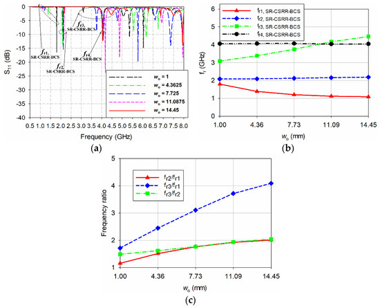 The effect of varying the position of the SR-CSRR-BCS slot in the patch on the resonant frequencies was next investigated, as shown in Figure 8. In this case, the offset wo from the radiating edge was changed from 1 mm (near the radiating edge) to 14.45 mm (center of the patch) with a step of 3.3625 mm. When the offset wo was increased from 1 mm to 14.45 mm so that the position of the SR-CSRR-BCS slot moved from near the radiating edge to the center of the patch, the first resonant frequency fr1,SR-CSRR-BCS decreased quadratically from 1.8 GHz to 1.09 GHz. In contrast, the second resonant frequency fr2,SR-CSRR-BCS increased slightly from 2.08 GHz to 2.186 GHz. The third resonant frequency fr3,SR-CSRR-BCS increased almost linearly from 3.088 GHz to 4.46 GHz, whereas the fourth resonant frequency fr4,SR-CSRR-BCS remained relatively constant between 4.046 GHz and 4.07 GHz. The frequency ratio between the first and second resonant frequencies (fr2,SR-CSRR-BCS/fr1,SR-CSRR-BCS) increased quadratically from 1.16 to 2.00, and the frequency ratio between the first and third resonant frequencies (fr3,SR-CSRR-BCS/fr1,SR-CSRR-BCS) increased quadratically from 1.72 to 4.09. The frequency ratio between the second and third resonant frequencies (fr3,SR-CSRR-BCS/fr2,SR-CSRR-BCS) increased linearly from 1.48 to 2.04. Therefore, if the proposed SR-CSRR-BCS slot-loaded MPA is used for a multiband antenna, the frequency ratio between the three resonant frequencies can be adjusted by changing the offset of the SR-CSRR-BCS slot from the radiating edge. In addition, impedance matching at the first resonant frequency deteriorated as the position of the slot moved toward the patch center.