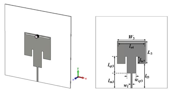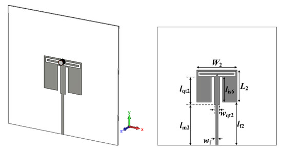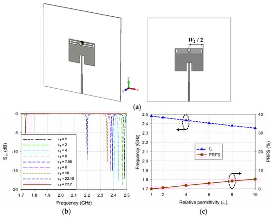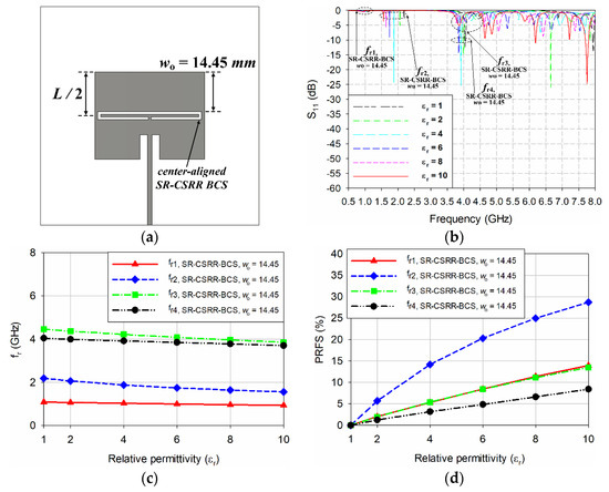 Finally, this study compared the input reflection coefficient characteristics, the values of the first four resonant frequencies, and the PRFS of the SR-CSRR-BCS slot-loaded MPA, when the SR-CSRR-BCS slot moved to the center of the patch (wo = 14.45 mm). Figure 9a shows the geometry of the center-aligned SR-CSRR-BCS slot-loaded MPA. The first four resonant frequencies of the center-aligned SR-CSRR-BCS slot-loaded MPA appeared at fr1,SR-CSRR-BCS,wo=14.45 = 1.09 GHz, fr2,SR-CSRR-BCS,wo=14.45 = 2.186 GHz, fr3,SR-CSRR-BCS,wo=14.45 = 4.46 GHz, and fr4,SR-CSRR-BCS,wo=14.45 = 4.046 GHz. The PRFS of fr1,SR-CSRR-BCS,wo=14.45, fr2,SR-CSRR-BCS,wo=14.45, fr3,SR-CSRR-BCS,wo=14.45, and fr4,SR-CSRR-BCS,wo=14.45 were 13.9%, 28.7%, 13.5%, and 8.4%, respectively, when the relative permittivity of the MUT superstrate varied from 1 to 10. The PRFS of the second resonant frequency, fr2,SR-CSRR-BCS,wo=14.45, was the largest among the four, but it was no better than that of the first resonant frequency for the radiating edge-aligned SR-CSRR-BCS slot-loaded MPA in Figure 1b. Therefore, the center-aligned SR-CSRR-BCS slot-loaded MPA might be useful for achieving a lower first resonant frequency with large size reduction and a large frequency ratio with the second and third resonant frequencies. However, its sensitivity to the relative permittivity was no better compared to the radiating edge-aligned SR-CSRR-BCS slot-loaded MPA.