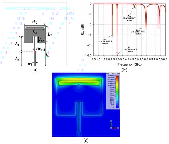 Scaled radiating edge-aligned SR-CSRR-BCS slot-loaded MPA with the first resonant frequency at 2.5 GHz: (a) antenna geometry, (b) input reflection coefficient characteristic, and (c) electric field distribution at 2.5 GHz.