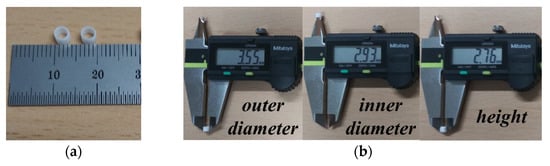 A hollow cylindrical liquid container made of acryl (εr = 2.56) was designed and fabricated using a laser cutting system (VLS 3.50 model, Universal Laser Systems, Scottsdale, AZ, USA), as shown in Figure 11. The dimensions of the fabricated liquid container were measured using a digital Vernier caliper (500-181-30, Mitutoyo Co., Kawasaki, Kanagwa, Japan). The measured outer diameter, inner diameter, and height of the fabricated liquid container were 3.55 mm, 2.93 mm, and 2.76 mm, respectively. Therefore, the inner volume of the fabricated liquid container is approximately 18.6 μL.