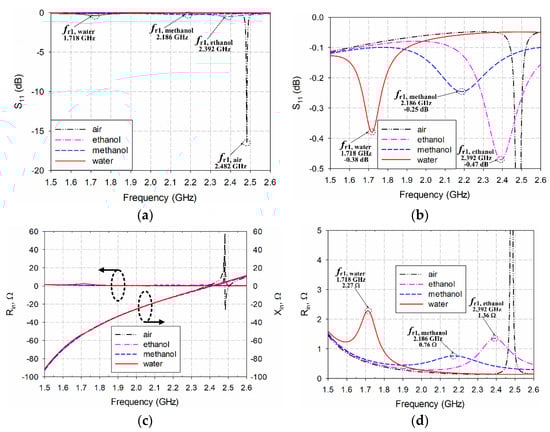 Responses of the scaled radiating edge-aligned SR-CSRR-BCS slot-loaded MPA with the liquid container at the center of the top-edge when loss tangent of ethanol, methanol, and water was applied for the MUT: (a) input reflection coefficient with full magnitude range, (b) input reflection coefficient with zoomed-in magnitude range, (c) input impedance, and (d) zoomed-in input resistance.