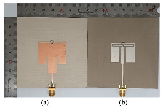 Figure 16 shows the prototypes of the scaled radiating edge-aligned RS-loaded and SR-CSRR-BCS slot-loaded MPAs with impedance-matching quarter-wavelength transformers were fabricated on an 80 mm × 80 mm RF-35 substrate (εr = 3.5, tan δ = 0.0018, h = 0.76 mm). The fabricated cylindrical liquid containers in Figure 11 were glued using silicon onto the center of the RS or the top-edge center of the SR-CSRR-BCS slot, as shown in Figure 16.