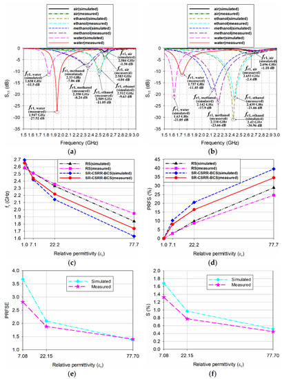 For the SR-CSRR-BCS slot-loaded MPA, the first resonant frequencies for air, ethanol, methanol, and water were 2.653 GHz, 2.439 GHz, 2.218 GHz, and 1.737 GHz, respectively. In contrast, the corresponding magnitudes of the input reflection coefficients at the first resonant frequencies were −2.4 dB, −21.66 dB, −23.31 dB, and −11.45 dB, respectively. The PRFS of the first resonant frequencies for ethanol, methanol, and water were 8.07%, 16.4%, and 34.53%, respectively. The measured PRFSE for ethanol, methanol, and water were 2.82, 1.88, and 1.4, respectively. We can see that measured PRFSE for ethanol and methanol was lower than the simulated one, but that for water was slightly higher. The simulated and measured sensitivity (%) of the proposed SR-CSRR-BCS slot-loaded MPA were calculated using Equation (7) to quantify the sensitivity of the proposed SR-CSRR-BCS slot-loaded MPA and compare it with other microwave sensors [13].