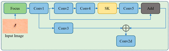In the proposed model, we stack the convolution and CSP modules three times after the focus module. In this regard, the shallow layer is expended to the similar size of CSP module feedback as the deeper layer, and the feature maps with different sizes are acquired step-wise. Then, we obtain full fine-grained features of shallow and deep semantic information as shown in Figure 3, where convolution represents three basic operations that are 2D convolution, batch normalization, and activation function. By the concatenation operation, the feature maps that have two convolution branches and the attention (SK Layer) are fused. Finally, a 128 × 128 features vector is extracted in the shallow layer. When comparing the proposed model with the YOLOv5m model that added 108 layers to extend the shallow layer of the CSP module, we only added 18 layers to the network without compromising the network performance.