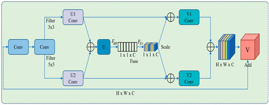 The improved version of the SK attention mechanism is directly employed in the residual blocks, which is divided into three parts such as (1) Split: separates the input vector to perform convolution operation with two different filters size i.e., 3 × 3 and 5 × 5 to achieve the output vectors and and acquired U after the addition process. (2) Fuse: utilizes the global average pooling denoted by () for the matrix compression to 1 × 1 × C, and employs a channel descriptor for the representation of each channel information. Thus, the dependency between channels is determined, which is mathematically formulated in Equations (1) and (2). The fully connected layers () established the relationship between the channels flexibility and nonlinearity. In the proposed work, we use two layers to add nonlinearity, fit the complex correlation between channels, decrease the training parameters and computations as much as possible, and obtain the weight value, as given in the following Equation: