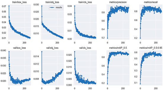 In Figure 6, the value of the loss function leads to declining during training, and the model parameters and their weights are continuously updated based on the SGD algorithm. After a few epochs, the model is capable of constantly reducing the loss function value while it is able to rapidly enhance the accuracy, recall rate, and precision as shown in Figure 6. Our proposed model achieves optimal performance in terms of evaluation matrices such as precision, recall, mAP, detection frame, object loss, and classification loss. The loss function value of the model in training and validation sets leads approximately to downward trends while the precision, recall, and mAP were on the peak on 200 epochs.