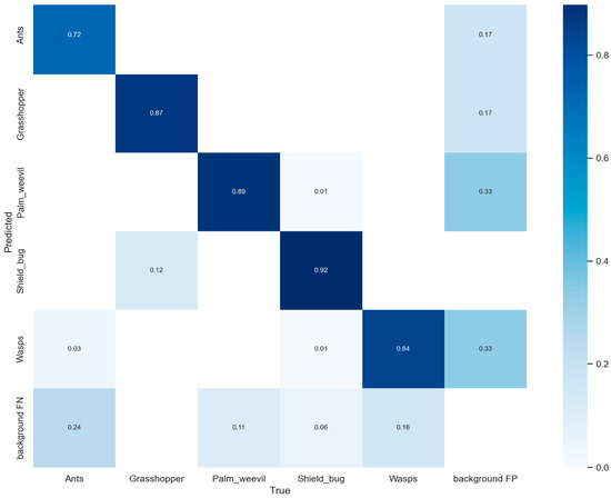The performance of the proposed model is further investigated by the confusion matrix using the test dataset as shown in Figure 7. In the confusion matrix, we have five different categories of pests including one extra category named background FN. The basic purpose of the background FN category is to highlight the none detected object in the image. To further investigate the confusion matrix of our model, the correct prediction of ants, grasshoppers, palm-weevil, shield_bug, and wasps’ classes is 0.72, 0.87, 0.89, 0.92, and 0.84, respectively.